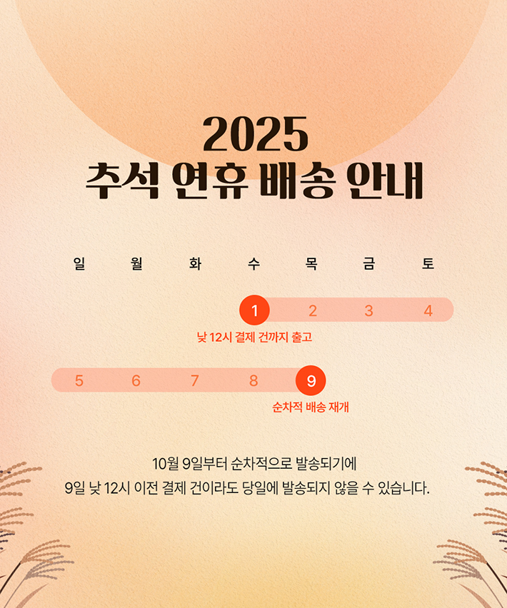 - 10¿ù 1ÀÏ(¼ö) ³· 12½Ã ÀÌÈÄ ÁÖ¹® °Ç : 10¿ù 9ÀÏ(¸ñ)ºÎÅÍ ¼øÂ÷Àû ¹ß¼Û